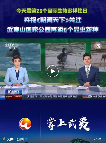 22日是第23個國際生物多樣性日,當天上午,央視《朝聞天下》播出《 武夷山國家公園再添6個昆蟲新種》。